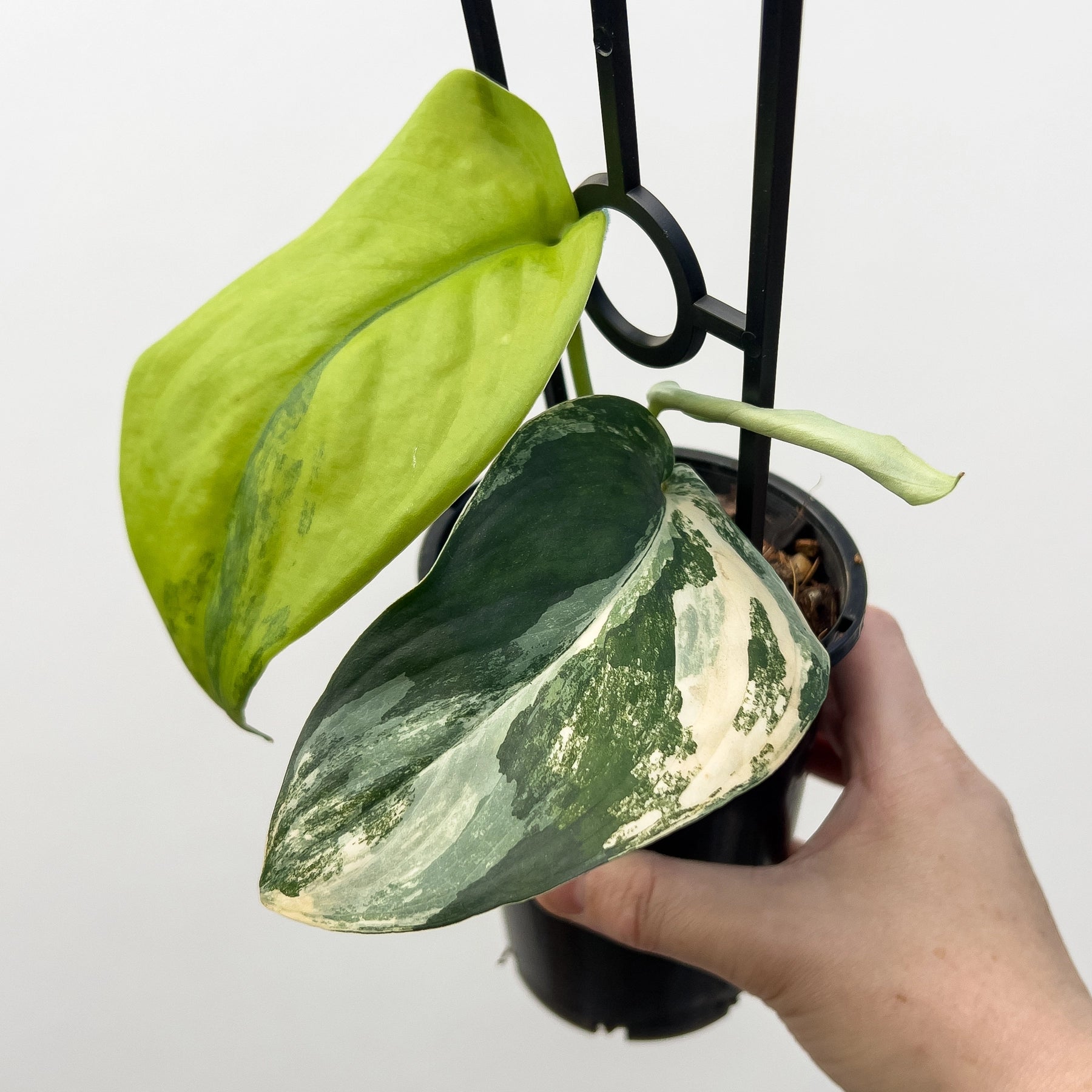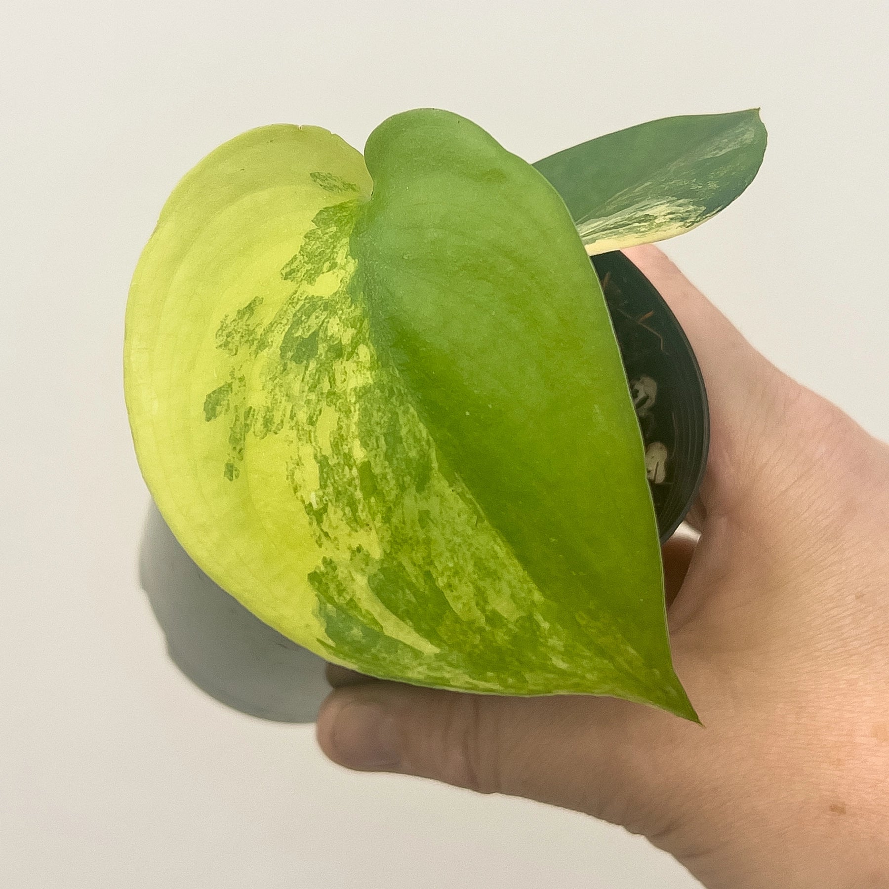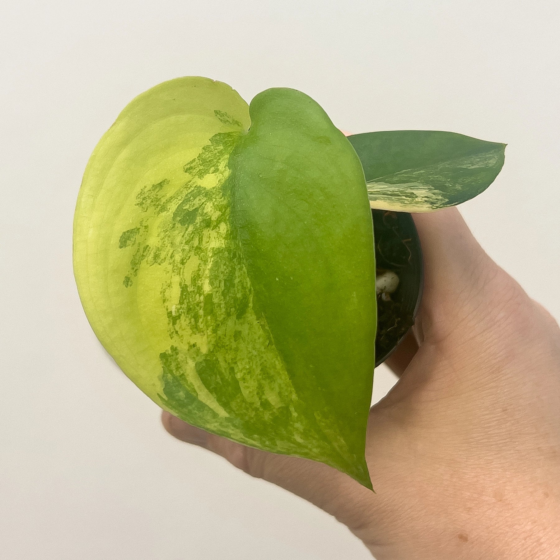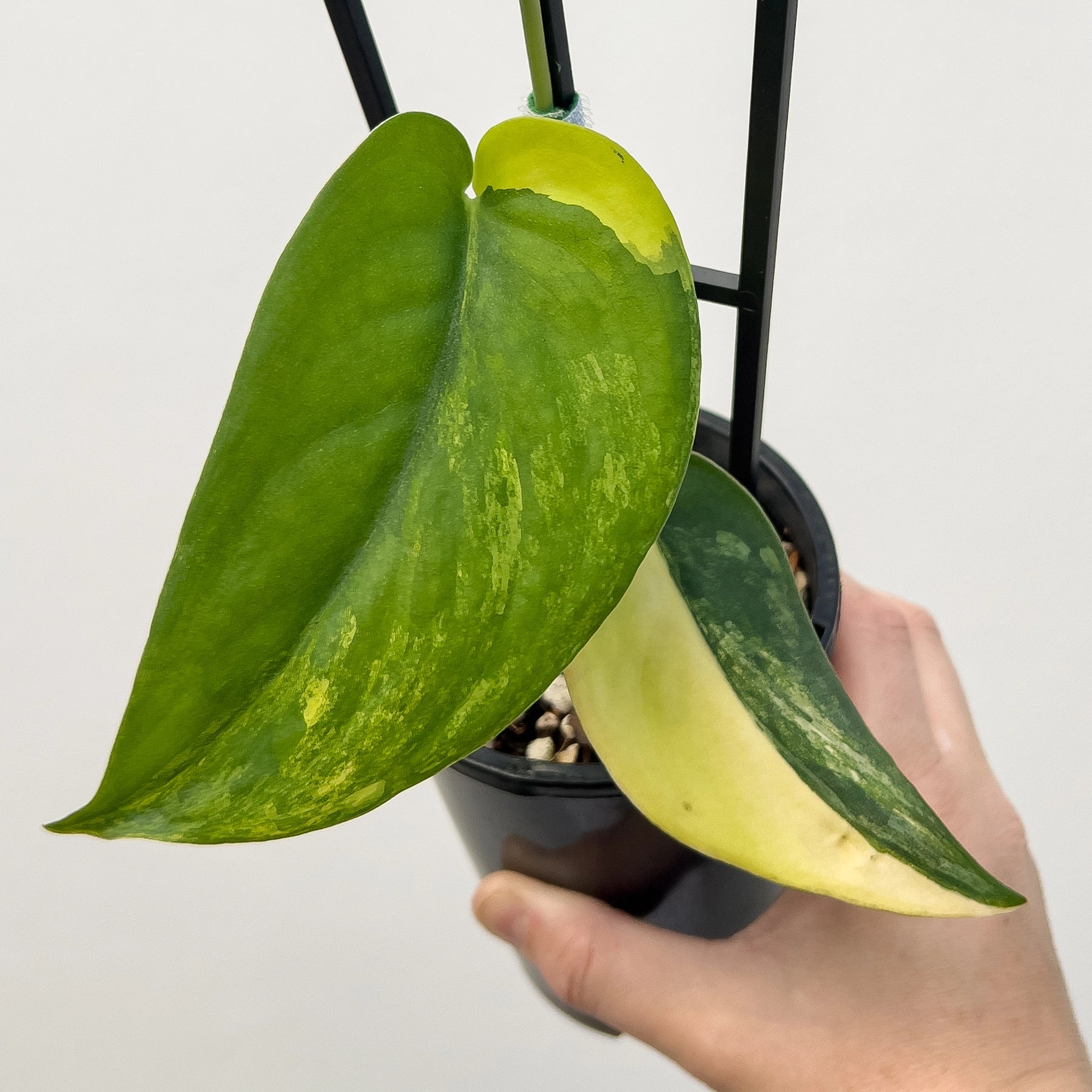 The Scindapsus pictus Jade Satin Aurea Variegated is an uncommon and stunning indoor plant known for its unique and striking foliage. The leaves are a jade green colour with a satin-like finish. Each leaf features variegated patterns of bright yellow and creamy white. The variegation can vary from subtle streaks to bold patches, making each leaf unique. The plant tends to have a trailing or climbing growth habit, making it perfect for hanging baskets or training on a trellis. Its lush, vibrant leaves add a touch of elegance and tropical beauty to any indoor space. They require bright indirect light to help brighten the yellow colour when the leaves unfurl.