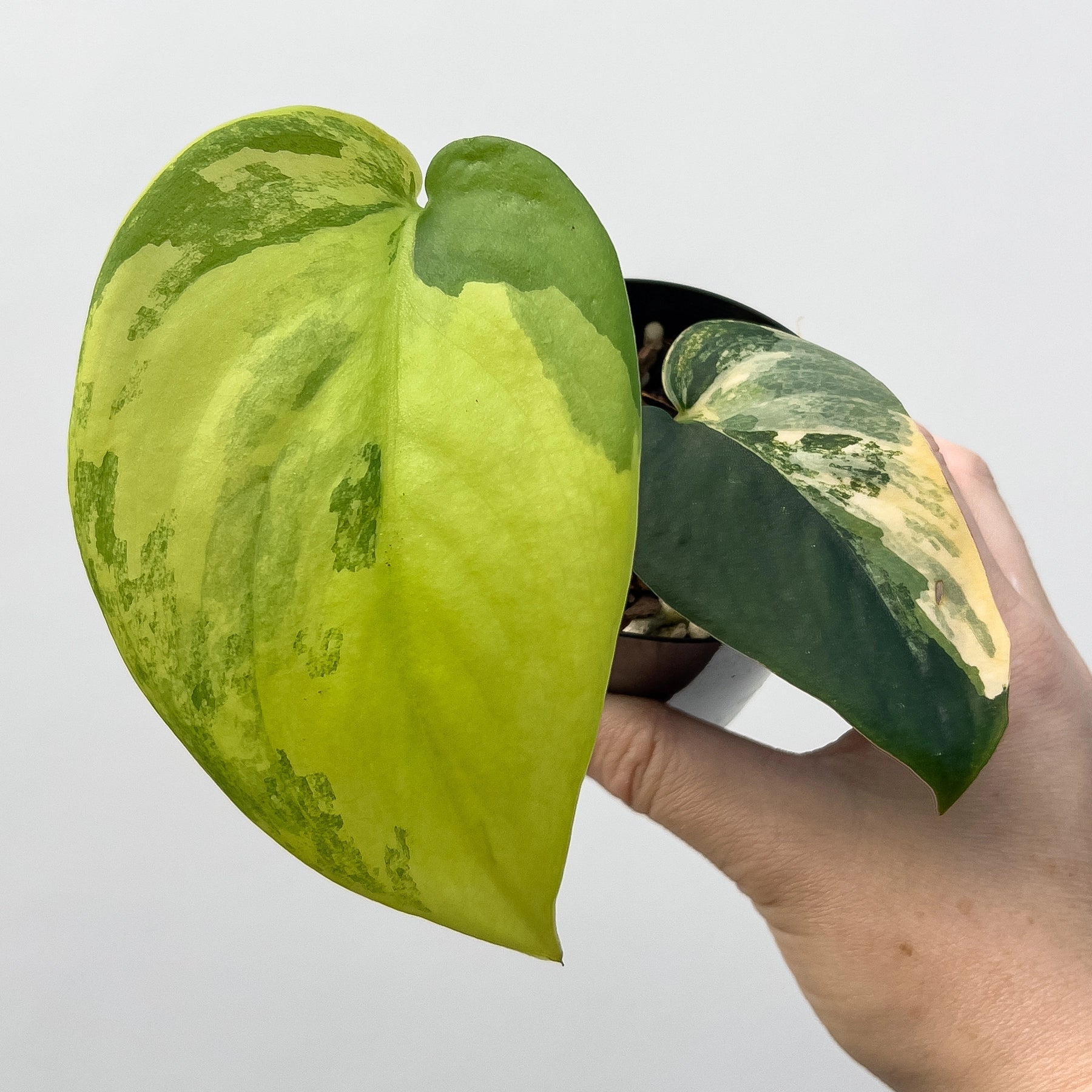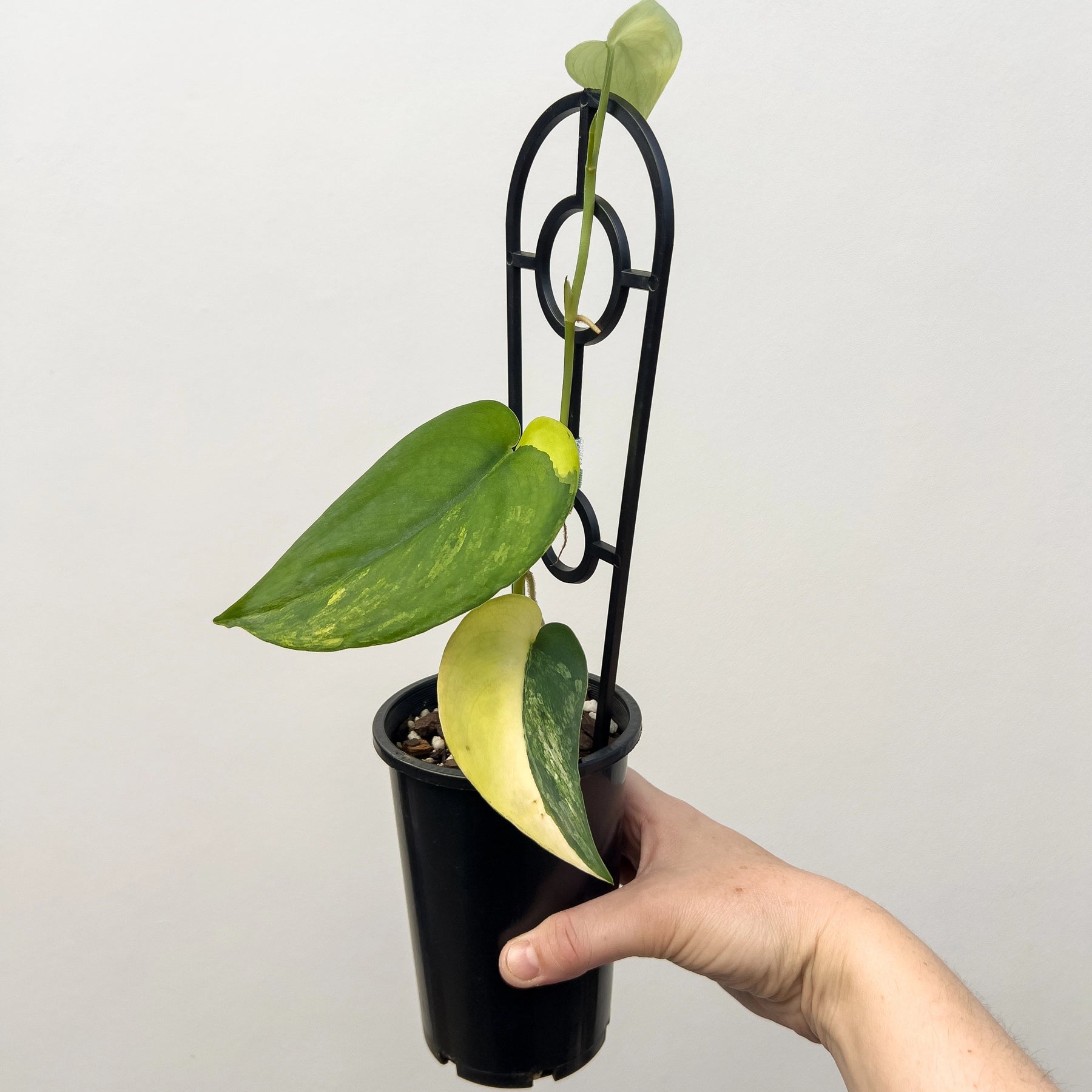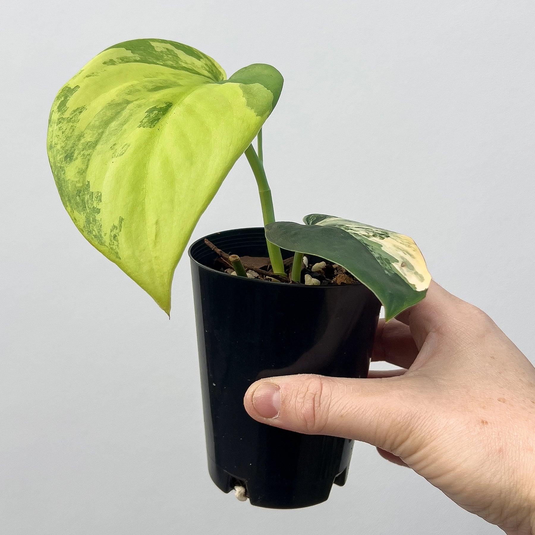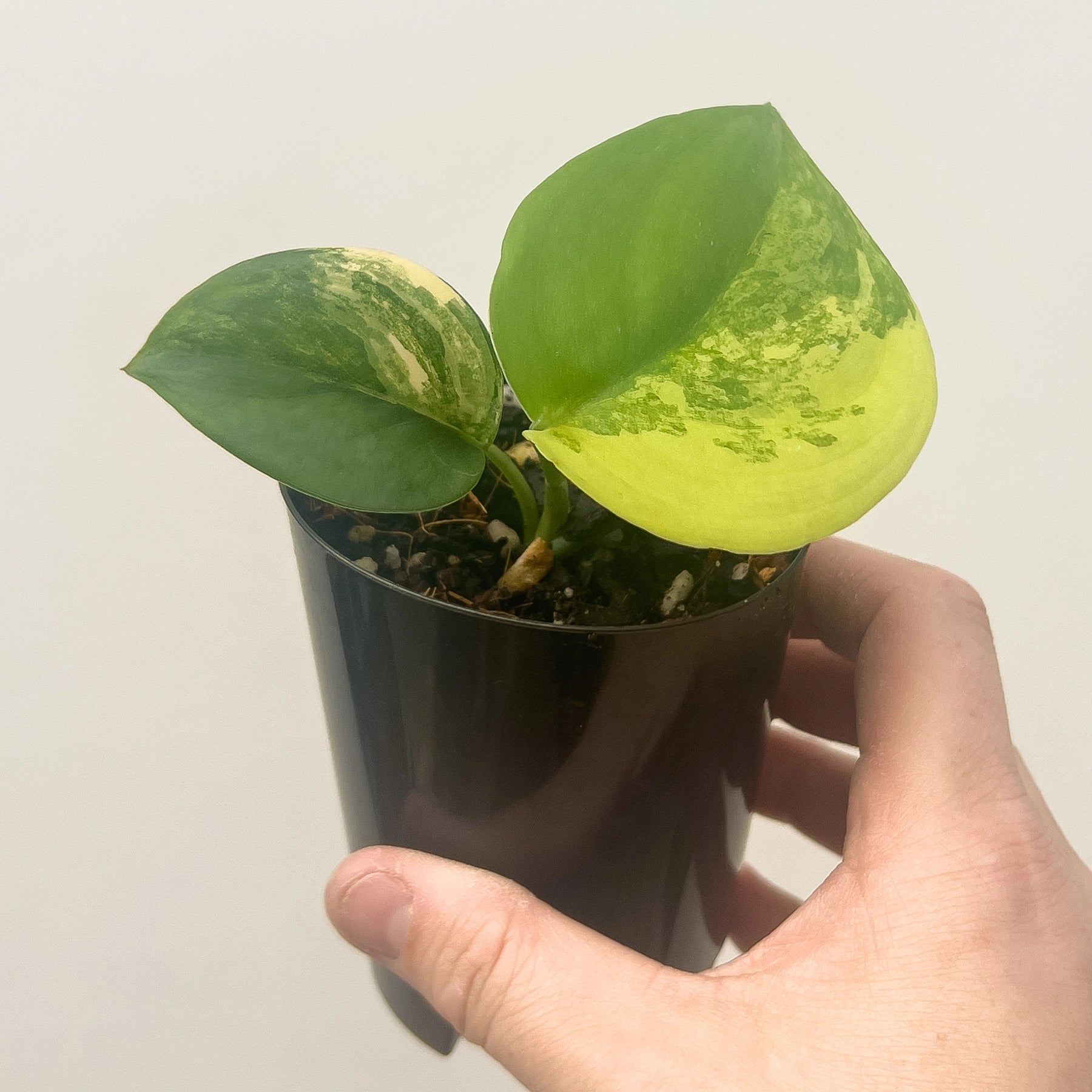 The Scindapsus pictus Jade Satin Aurea Variegated is an uncommon and stunning indoor plant known for its unique and striking foliage. The leaves are a jade green colour with a satin-like finish. Each leaf features variegated patterns of bright yellow and creamy white. The variegation can vary from subtle streaks to bold patches, making each leaf unique. The plant tends to have a trailing or climbing growth habit, making it perfect for hanging baskets or training on a trellis. Its lush, vibrant leaves add a touch of elegance and tropical beauty to any indoor space. They require bright indirect light to help brighten the yellow colour when the leaves unfurl.