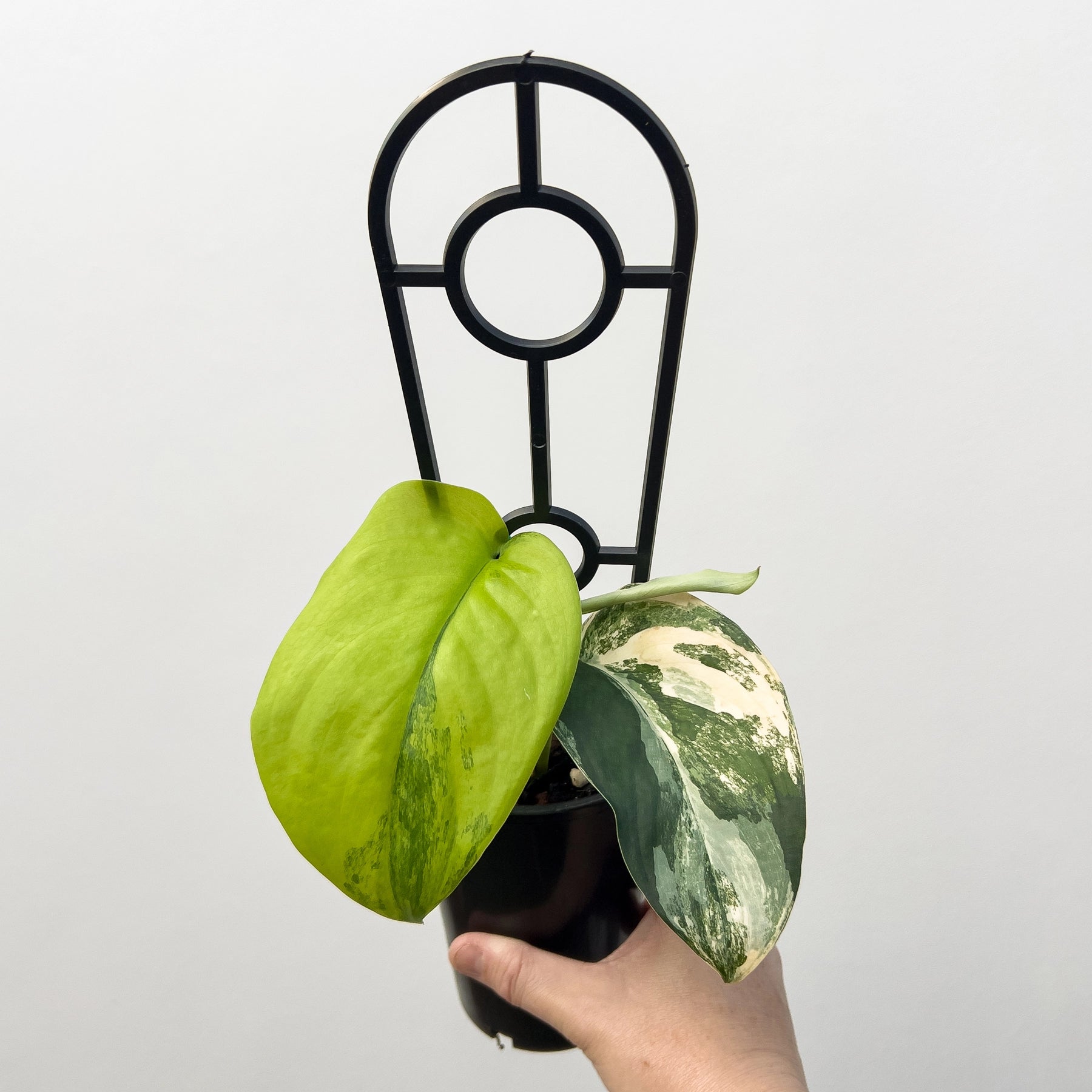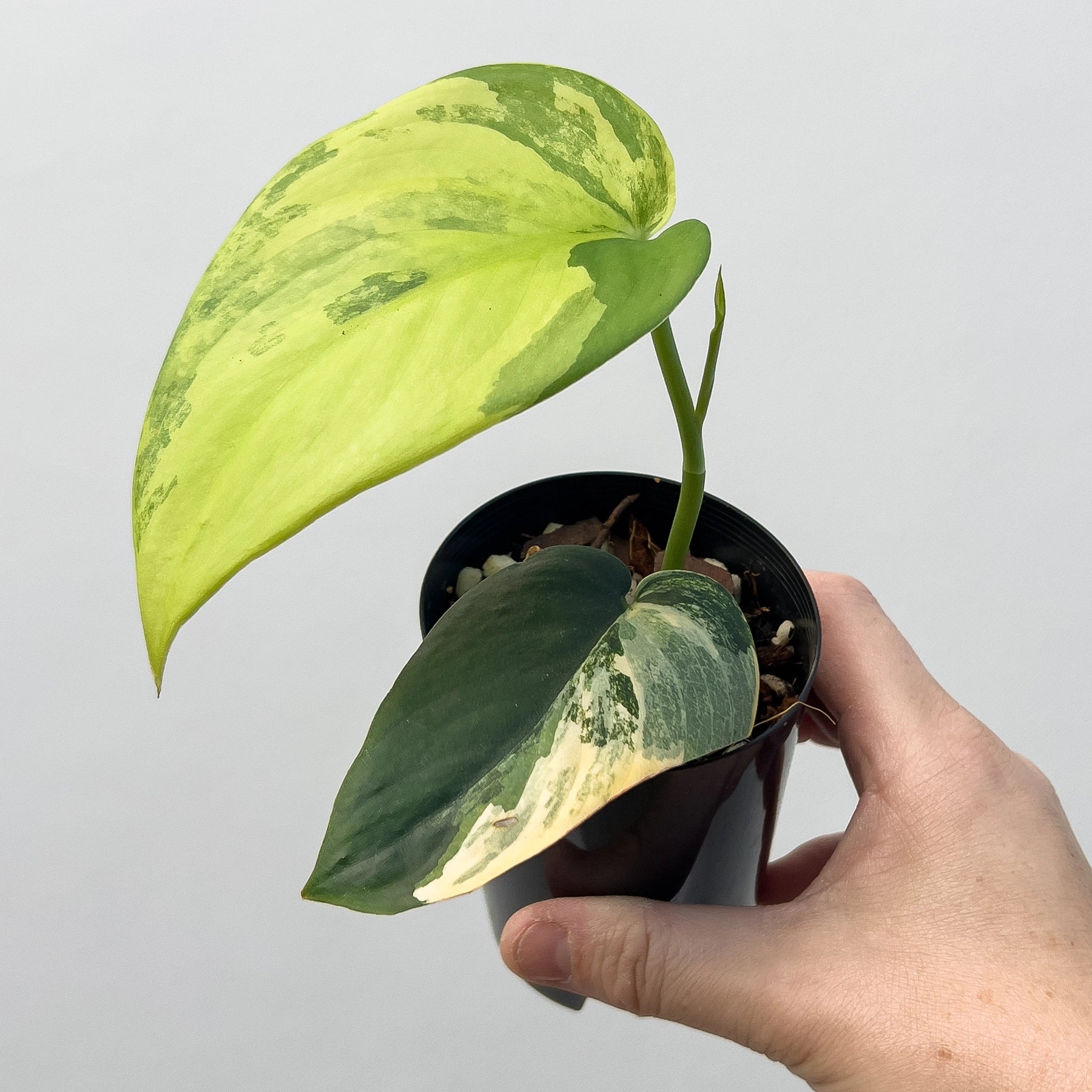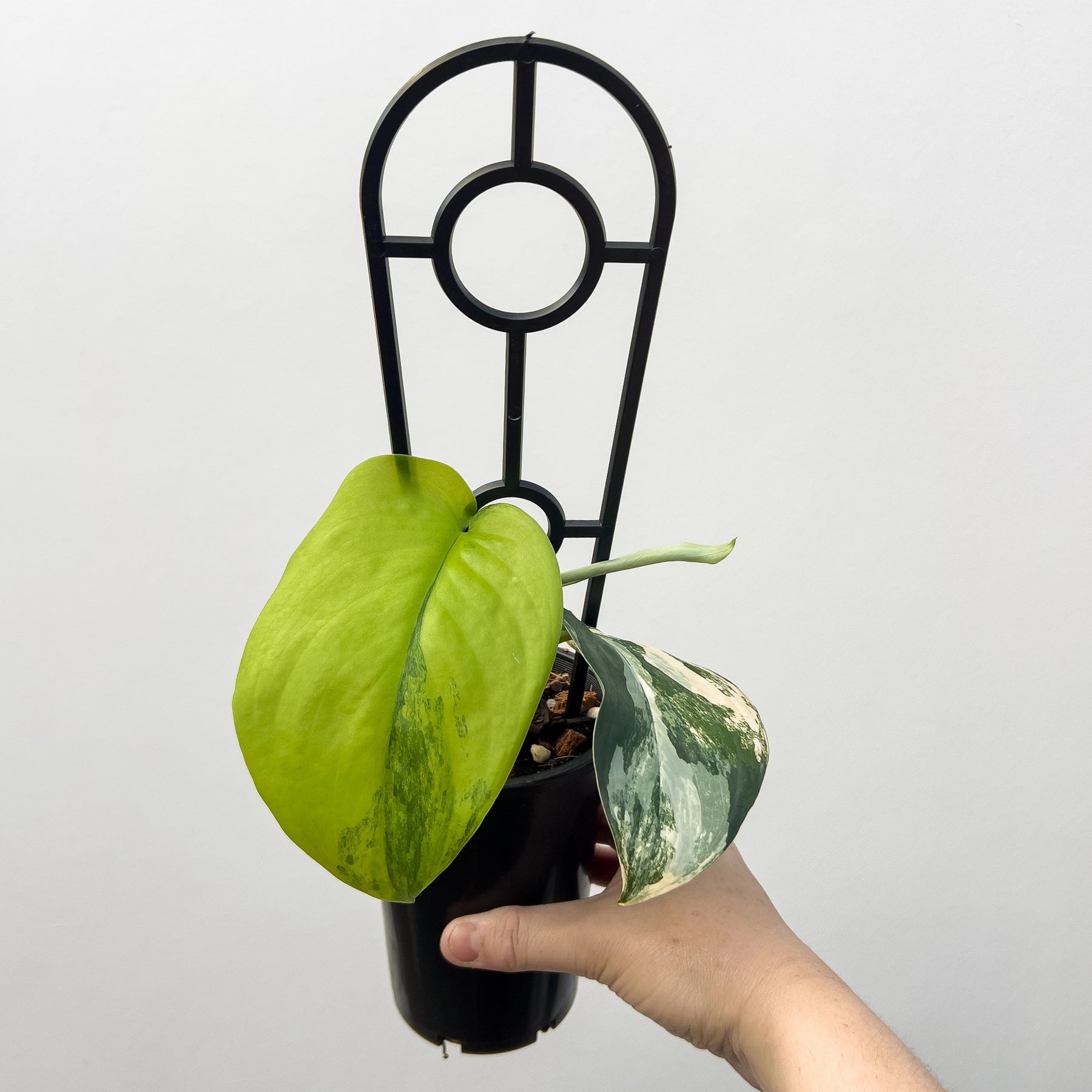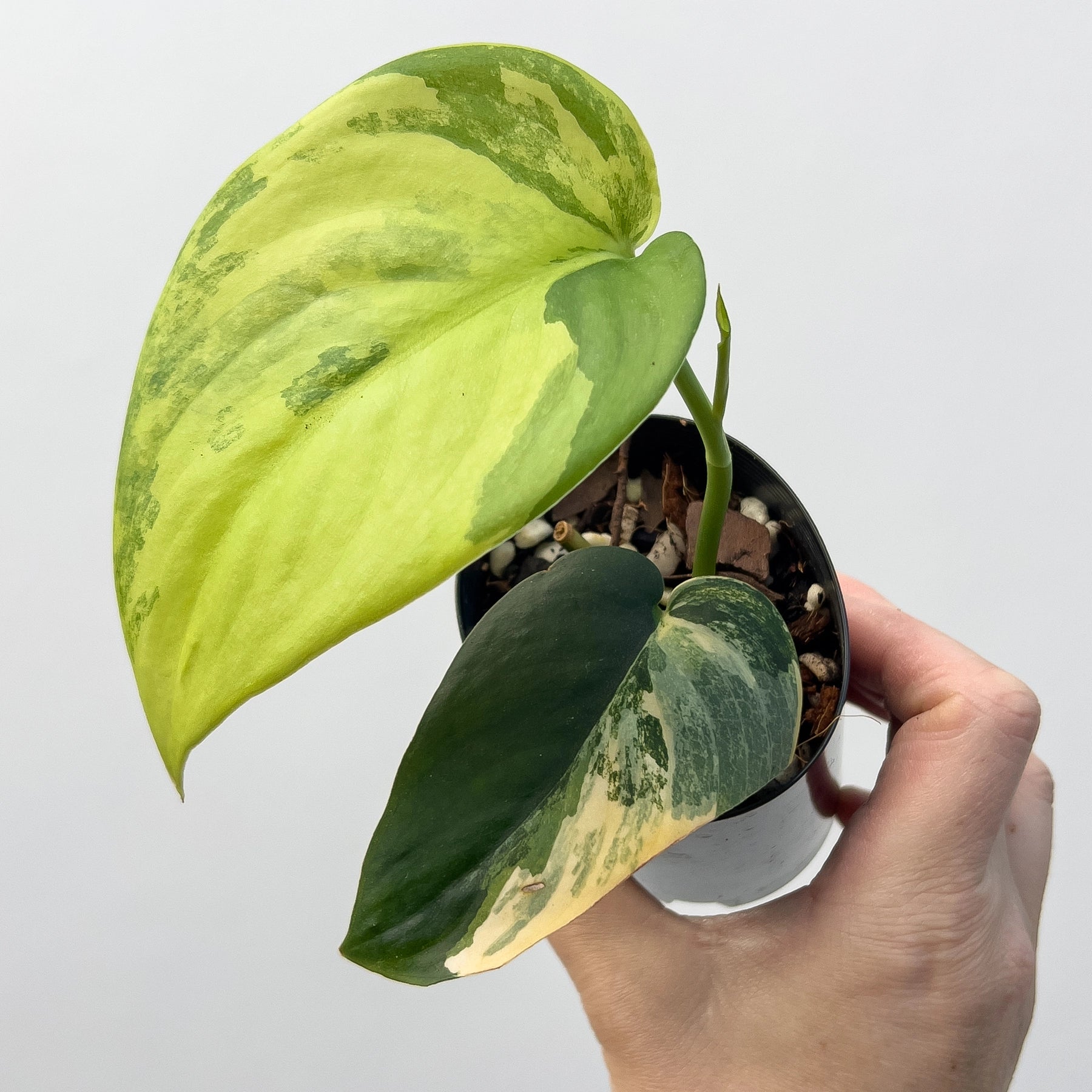 The Scindapsus pictus Jade Satin Aurea Variegated is an uncommon and stunning indoor plant known for its unique and striking foliage. The leaves are a jade green colour with a satin-like finish. Each leaf features variegated patterns of bright yellow and creamy white. The variegation can vary from subtle streaks to bold patches, making each leaf unique. The plant tends to have a trailing or climbing growth habit, making it perfect for hanging baskets or training on a trellis. Its lush, vibrant leaves add a touch of elegance and tropical beauty to any indoor space. They require bright indirect light to help brighten the yellow colour when the leaves unfurl.