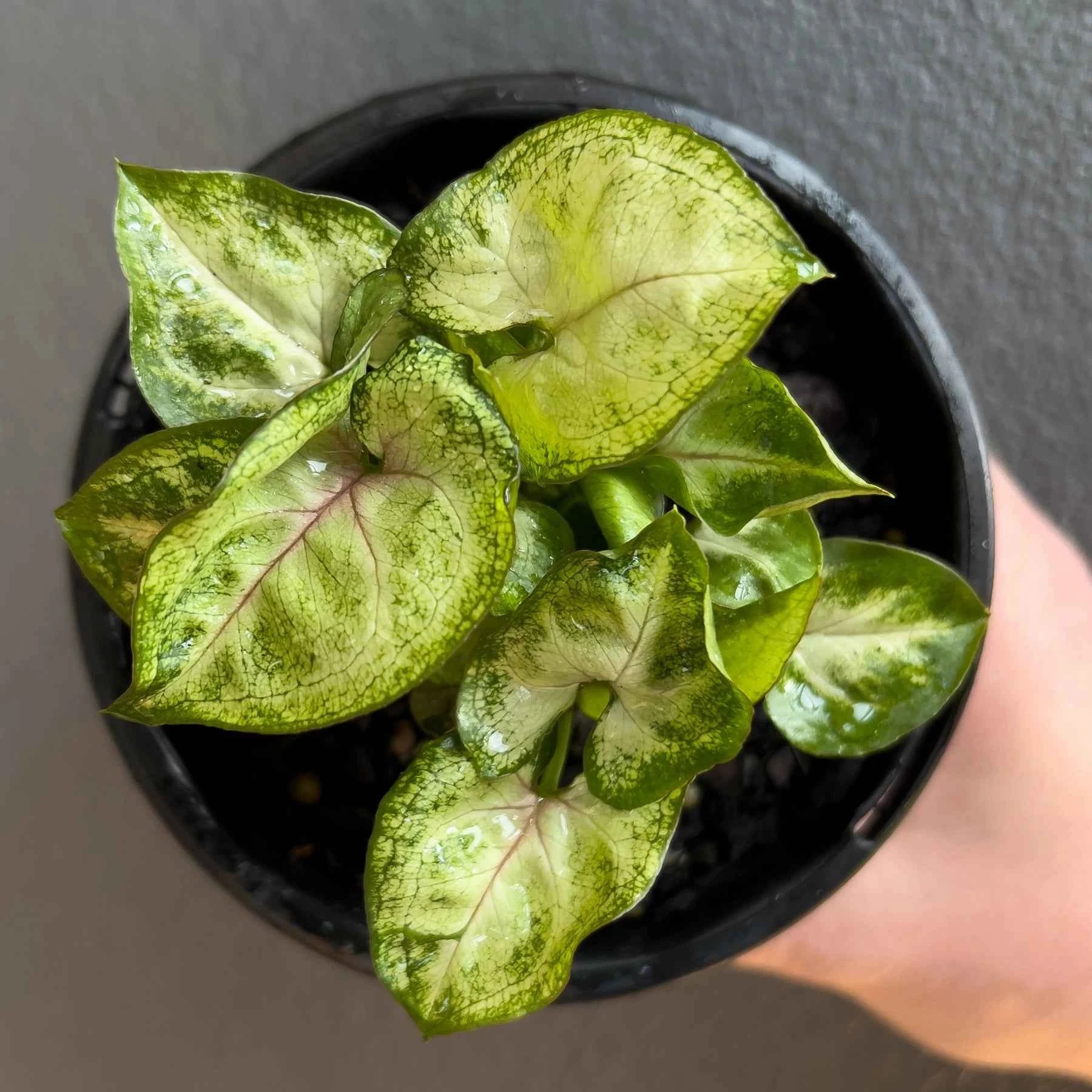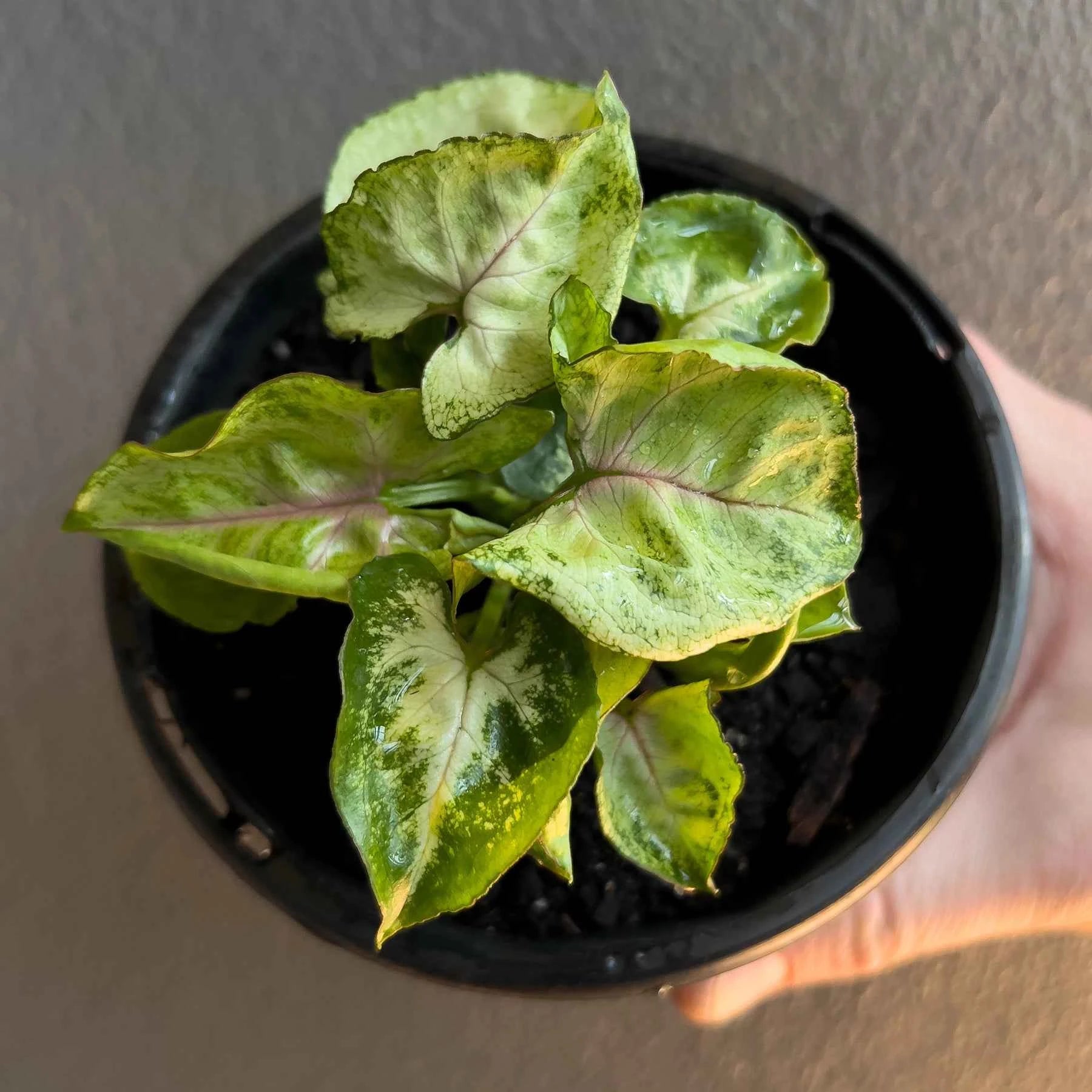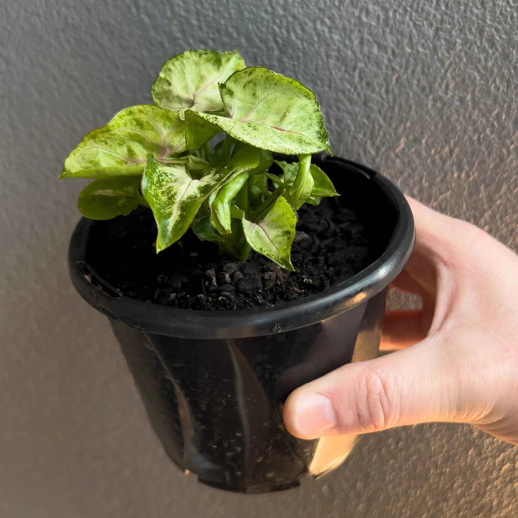 Syngonium ‘Sunshine Speckles’ brings a bright, cheerful look to any plant collection. Its arrow-shaped leaves are a fresh medium green base, irregularly freckled and speckled with golden or creamy-yellow variegation that catches the light beautifully. The pattern varies leaf to leaf, making each plant unique. As leaves mature they retain their friendly, airy green tone with variegation that softens yet remains distinct. With a compact, tidy growth habit this Syngonium suits shelves, side tables or moderate light corners where it can show off its cheerful speckled foliage without demanding too much space.